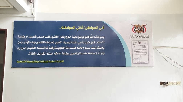 بتوجيهات من وزير العدل وحقوق الإنسان.. تركيب لوحات إرشادية وتوعوية في محاكم الأمانة وصنعاء