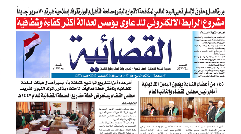 • عدد صحيفة القضائية رقم (237) الصادر بتاريخ الثلاثاء 3ربيع الاول 1447هـ 26 اغسطس 2025م