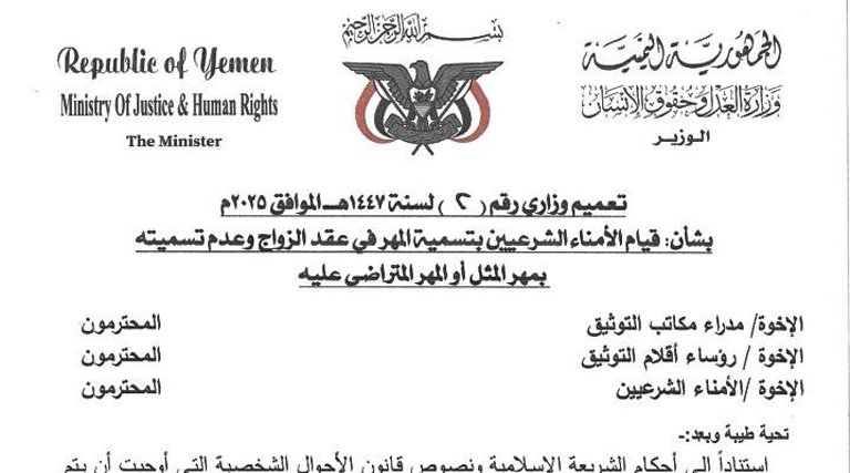 وأكد التعميم، الصادر عن القاضي إبراهيم محمد أحمد الشامي القائم بأعمال وزير العدل وحقوق الإنسان، أن بعض العقود التي تمت مراجعتها تضمنت تسميات فاسدة للمهر تخالف مقتضى الشرع والقانون، كونها تؤدي إلى الجهالة وتفتح باب النزاع بين الأطراف.